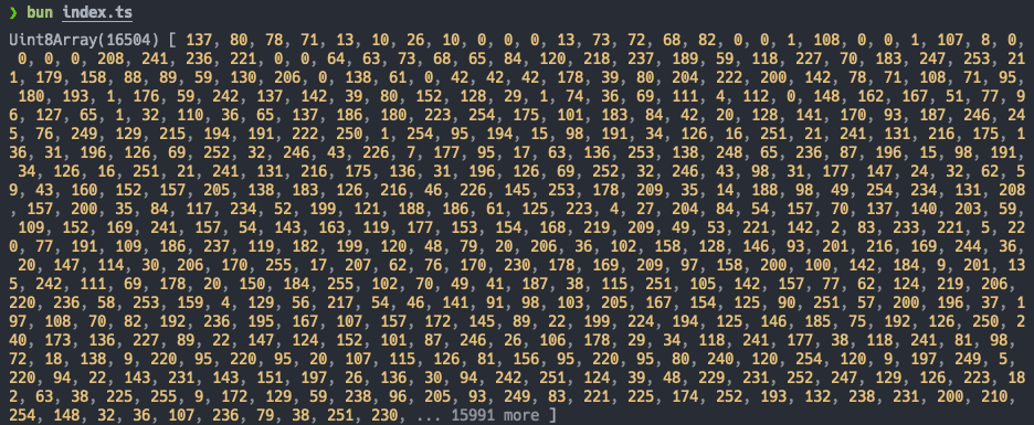 import * as fs from 'node:fs';import * as path from 'node:path';const process = async () => {const handle = await fs.promises.open(path.resolve('./image.png'), 'r');const { size } = await handle.stat();const input = new Uint8Array(size);await handle.read(input, 0, size, 0);const imageSize = parser(input);await handle.close();return imageSize;};const pngSignature = 'PNG\r\n\x1a\n';const ihdrChunkType = 'IHDR';const parser = (input: Uint8Array) => {// File signature가 PNG인지 검사const signature = toUTF8String(input, 1, 8);if (signature !== pngSignature) return null;// Chunk Type이 IHDR인지 검사const chunk = toUTF8String(input, 12, 16);if (chunk !== ihdrChunkType) return null;// Width, Height 추출const size = {width: readUInt32BE(input, 16),height: readUInt32BE(input, 20),};return size;};/* Utility */const toUTF8String = (input: Uint8Array, start: number, end: number) => {const decoder = new TextDecoder();return decoder.decode(input.slice(start, end));};const readUInt32BE = (input: Uint8Array, offset = 0) => {const view = new DataView(input.buffer, input.byteOffset + offset);return view.getUint32(0, false);};await process();